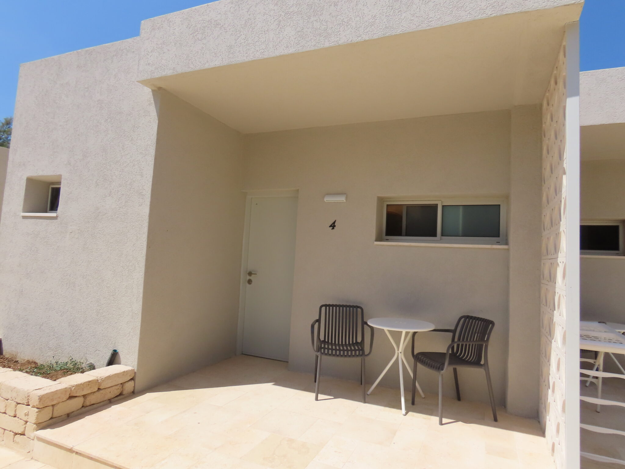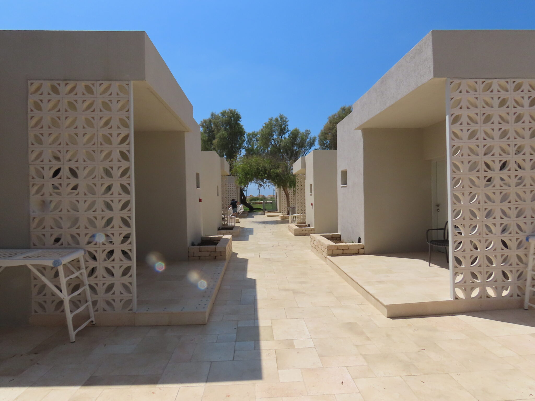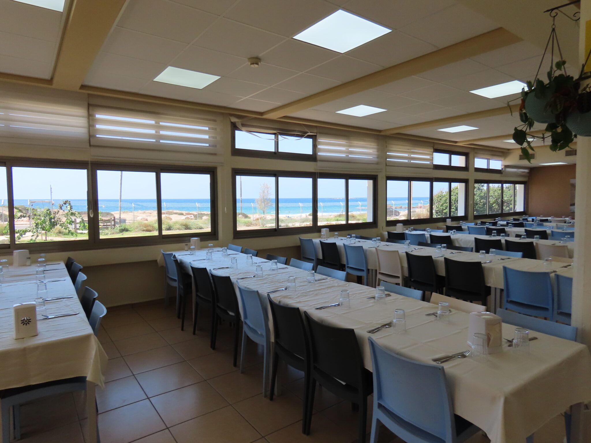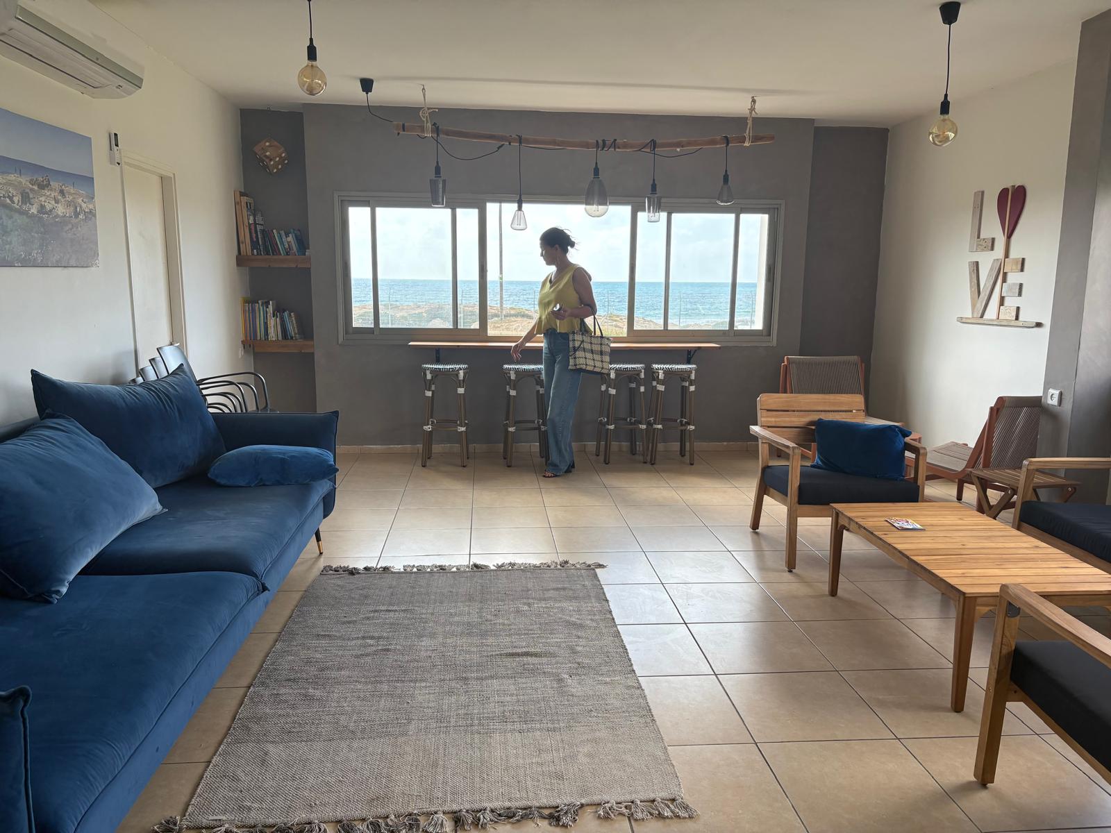 חצר מול הים עם כסאות ושולחנות